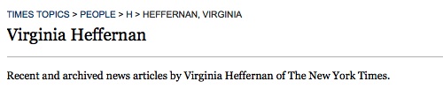 VIRGINIA HEFFERNAN writes "The Medium," a weekly column about Internet culture, for The New York Times Magazine. Before starting The Medium in 2007, she served for four years as a daily television critic for The Times, where she also chronicled the convergence of television and the Internet in Screens, one of the first blogs on the Times's Web site. She has also contributed to The New Yorker, Slate, Mother Jones and many other publications. She is the author, with Mike Albo, of the comic novel The Underminer, and her work has been widely anthologized. In 2002, she received a Ph.D. in English and American Literature from Harvard.