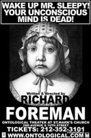 In 2005, Edge featured Richard Foreman's "The Pancake People, or, 'The Gods are Pounding My Head' " in which he noted that "I see within us all (myself included) the replacement of complex inner density with a new kind of self-evolving under the pressure of information overload and the technology of the "instantly available". A new self that needs to contain less and less of an inner repertory of dense cultural inheritance—as we all become "pancake people"—spread wide and thin as we connect with that vast network of information accessed by the mere touch of a button". He then announced his 40+ career as New York's leading avant garde theatrical director had come to an end, and he was going to begin exploring film. Now Foreman is back as a new hybrid vision Still young and artistically radical as he approaches 70, Richard Foreman's 45th Ontological-Hysteric production plunges into a new world in which human consciousness is turned inside out. Wake Up Mr. Sleepy! Your Unconscious Mind Is Dead! is his second project defining a new kind of theater in which film and live action trace parallel contrapuntal dream narratives. Wake Up Mr. Sleepy! postulates the invention of the airplane (controlled by a horde of baby-doll pilots) as the death knell of the unconscious mind. Foreman is responding to a world in which visionary sages and poets are being replaced by specialists who make platitudes out of the immediately observable and hand-feed them to the public. In Richard Foreman's universe, his muse and ally, the unconscious, fights back to life in a shape resembling “the stone that rolls up the hill backwards” (the evil one) and from such “evil”, life renews itself.