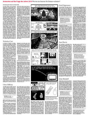 The Question of 2010 On that Friday in January 2010 published by the American literary agent John Brockman, the question of 2010: How the Internet and networked computers to change the way we think? At the core of the debate lies the question asked by science historian George Dyson: "Is the price of machines that think, people who will not do?" Brockman, who counts some of the most important scientists of our time as his authors, this vision orbits on Edge.org with one hundred twenty-one answers. We print the most interesting in the features section. Unlike Germany, where the debate about the information age is still focused on palaver about media, Edge debates the target in depth. Who is planning what, where, by what means? If one takes the digital revolution seriously , one must ask to what degree the communication of the industrialized twenty-first century will change our thinking. The computer pioneer Daniel Hillis describes how even such a simple procedure such as the programming of the time on networked computers is now barely understood by many programmers. And he concludes, with regard to climate change and financial crisis: "Our machines are embodiments of our reason, and we entrust them with a large number of our decisions. In this process we have created a world that is beyond our understanding. Experts no longer talk about data, but about what computers predict with the data." Neurobiological effects of constant multitasking lead, as Nicholas Carr writes about outsourcing, for ever-increasing dependence on computers. What if not only decisions about loans and budgets were subject to the use of computers, but also those regarding resumes? After the recent incidents in America, profiling is an even more important means of web-based "pre-crime" analysis: Who is planning what, where, by what means? But profiling what works with terrorists can also be applied to in enterprises and workplaces as Cataphora.com has shown. Been overtaken by reality Some of those authors presented by Brockman do not find that the Net has changed their thinking. Others see it differently. Nobody, not even the skeptics, long to return to a time before the Internet. But many make it clear that what we experience as a user is in fact only a "surfing", a movement on the surface. The German Internet debate is stuck in the nineties. Brockman's question this year sets the chord for questions that take us beyond this set of attitudes. Frank Schirrmacher |