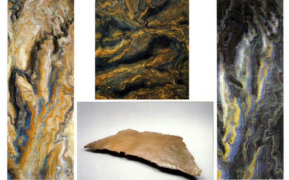 Examples of my map paintings - these are of the Grand Canyon, the bronze is from my "Lakes' series ?Clockwise from left: Bright Angel 2001 132" x 48" ink & oil paint on canva; Obi Canyon - 2001 66"x 48" ink and oil paint on canvas; Bright Night 2001 132" x 48" ink & oil paint on canvas; Edison Lake - 1976 cast bronze